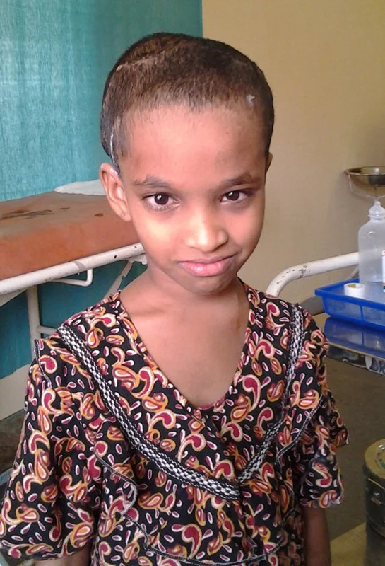 Die 9 Jahre alte Tasreen wurde mit einer schweren Fehlbildung des Gehirns bzw. Schädels geboren, der sogenannten „Dandy-Walker-Malformation“. Sie hat einen riesigen Knochendefekt am Hinterkopf, die Hirnmasse ist praktisch nicht mehr geschützt.